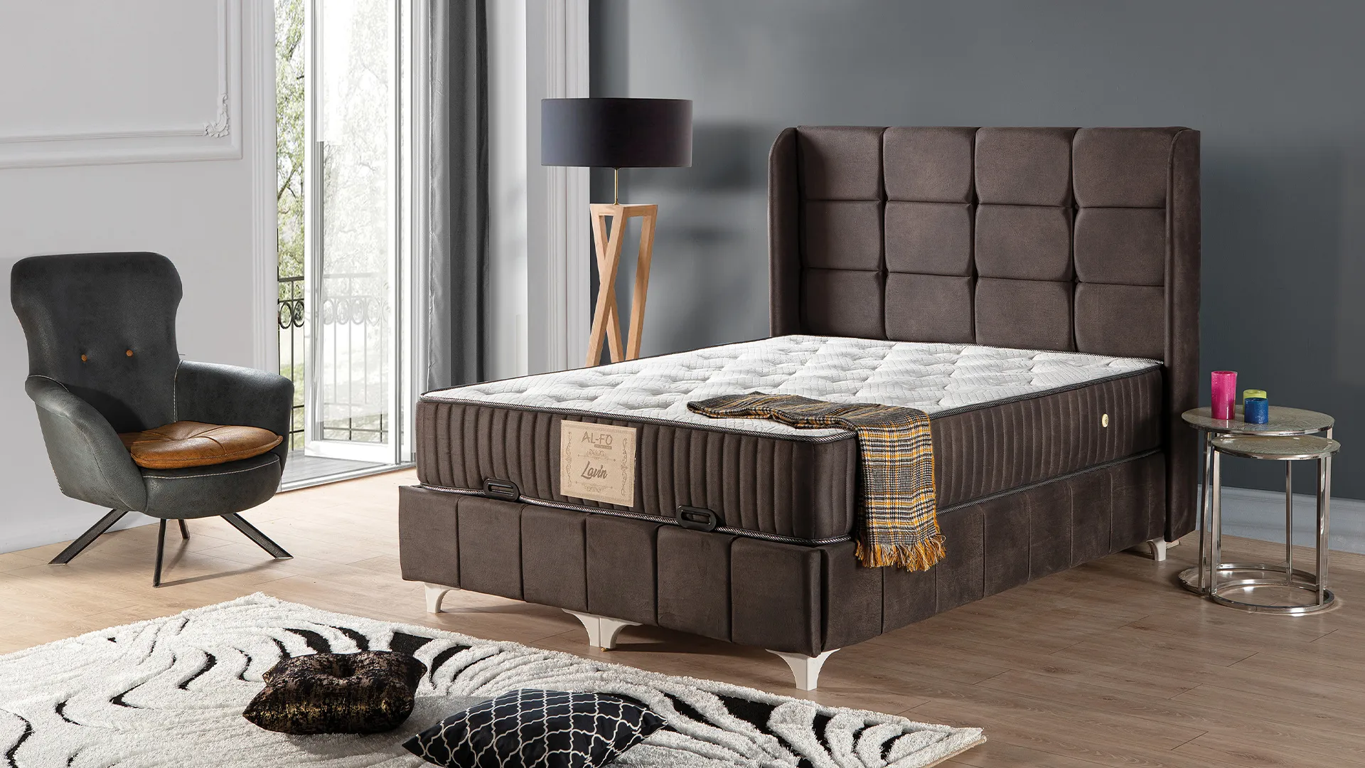 Modern yatak odası dekorasyonlarına uyum sağlayan zarif tasarım, geniş depolama alanlarıyla fonksiyonel bir kullanım sunar. Baza başlığı ise, odaya sofistike bir dokunuş ekleyerek modernliği yansıtır.