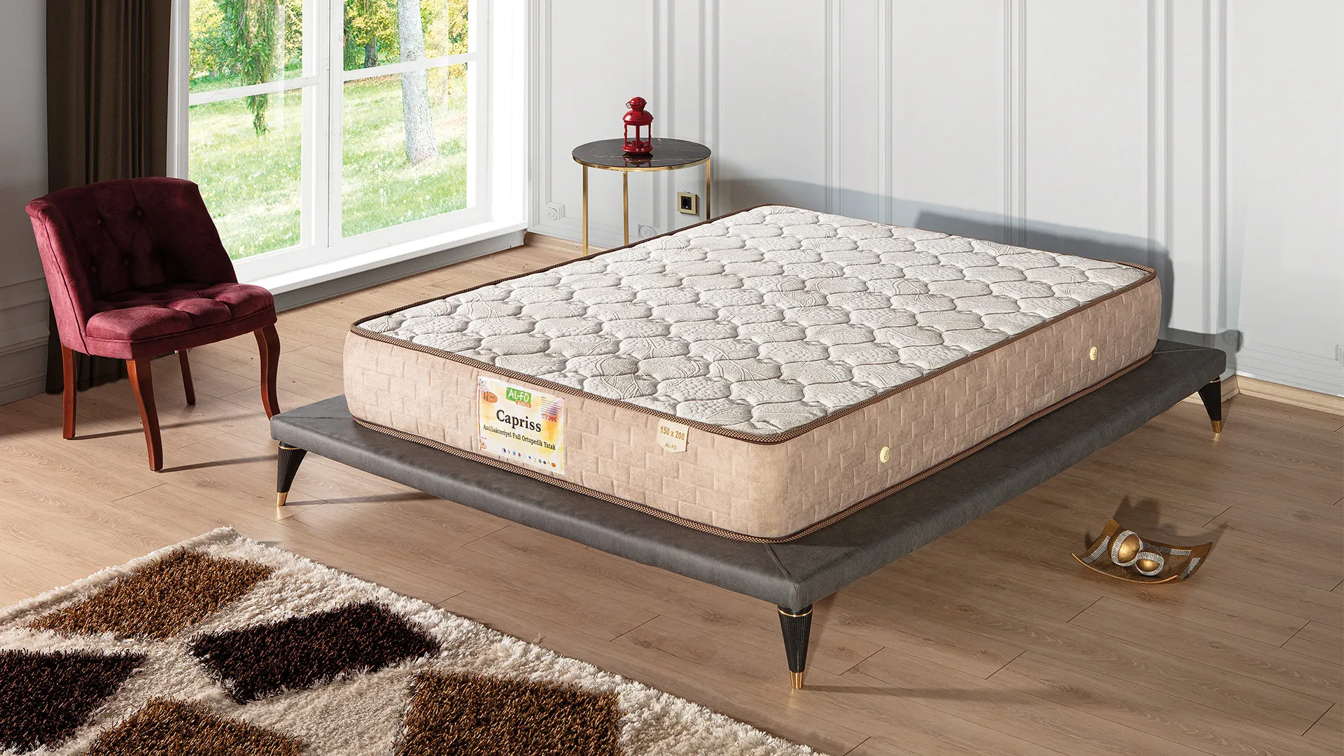 Ağırlığı yüzeye eşit yayan özel keçe sistemi sayesinde vücut ısısını dengeleyen Capriss, çift yönlü kullanımı ve pelüş kumaşı ile rahat bir uyku sunar.